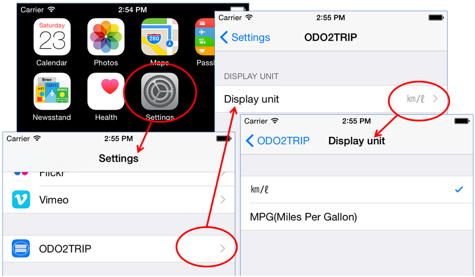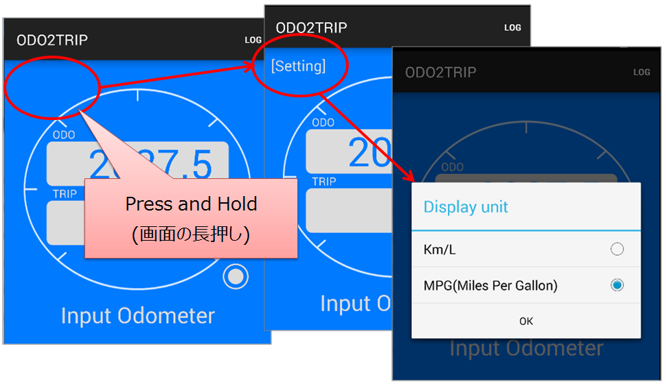 ODO2TRIP iOS版とAndroid版とでは表示単位(km/LとMPG)の切り替え方式が異なります。