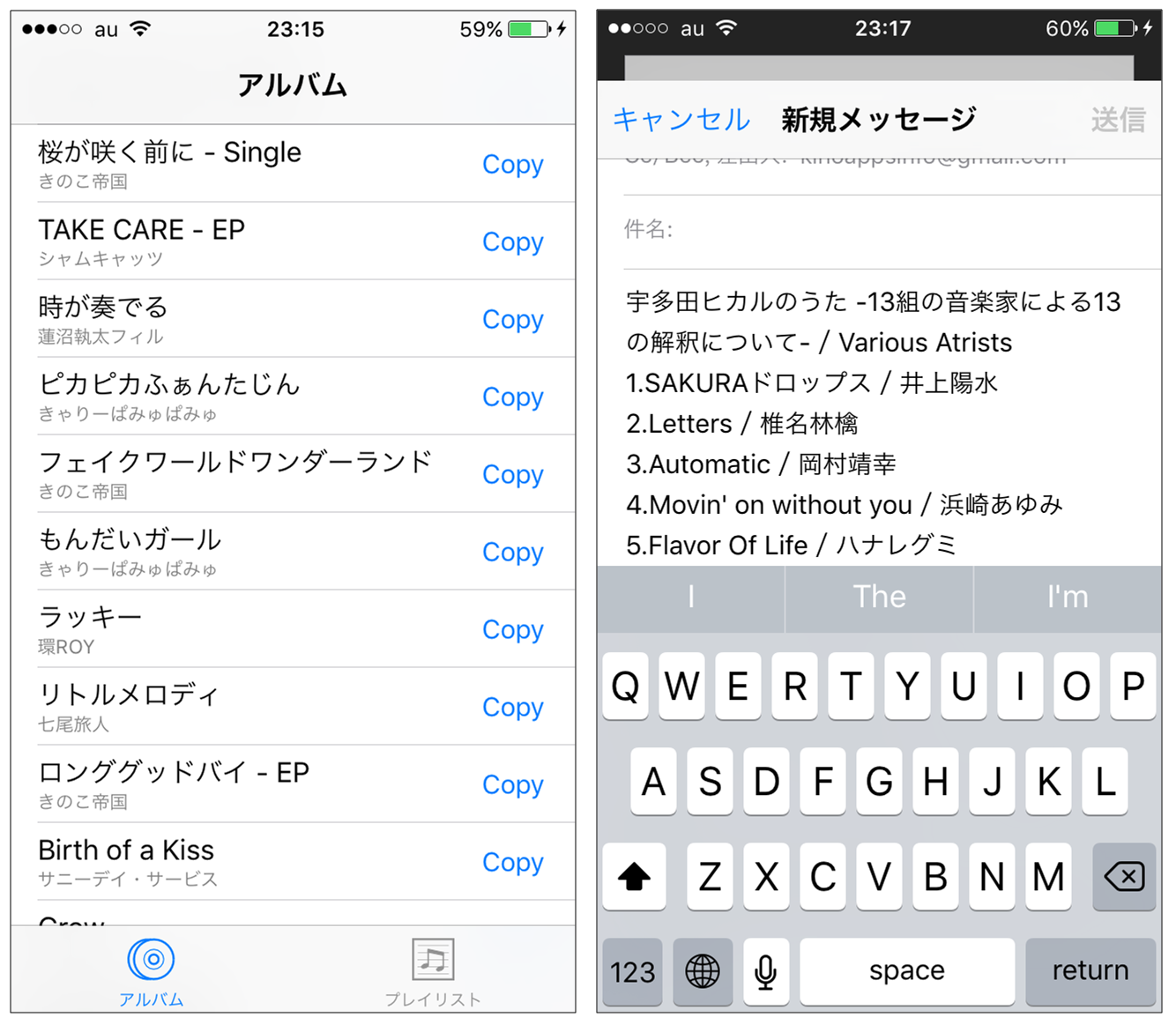 コピーした曲リストはメモ、メール等のアプリで貼りつけて使用できます。