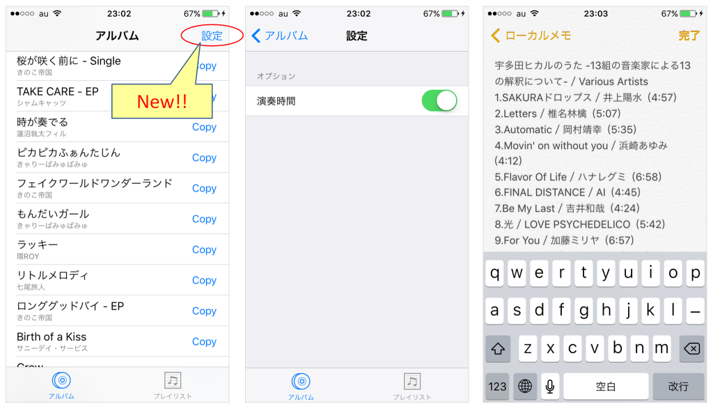下図のように「アルバム」タブ上位の「設定」ボタンを押すと設定画面が表示されます。ここで[オプション]-[演奏時間]をオンにすると、コピーした曲リストに演奏時間が追加されるようにしました。