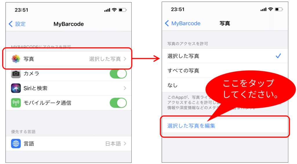 3)[MYBARCODEにアクセスを許可]の「写真」を選択します。(この段階では「選択した写真」が選択されています。)